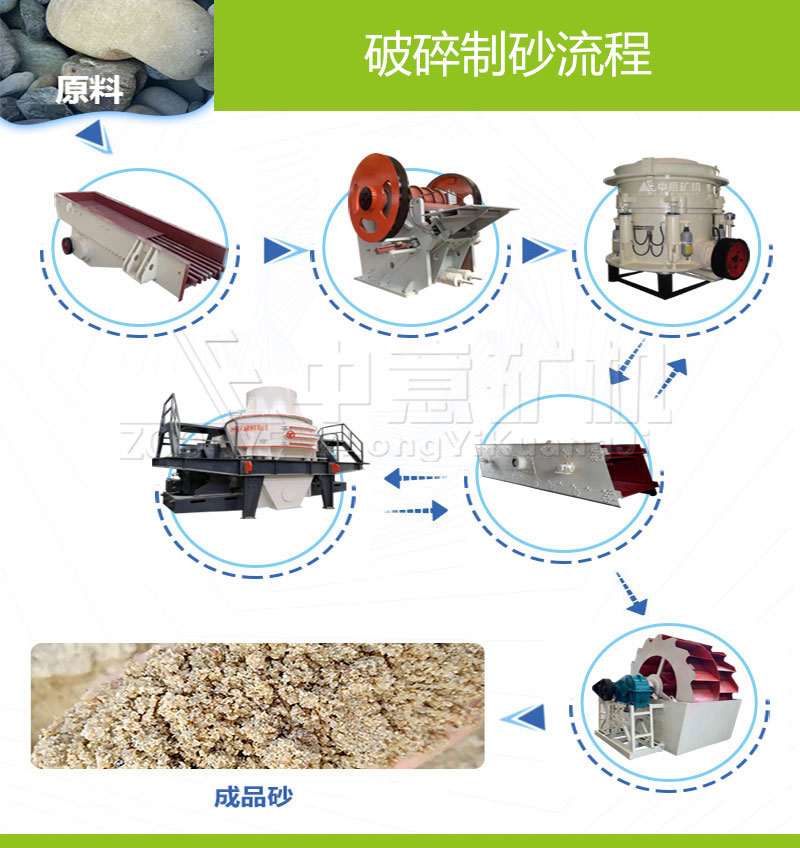 制砂生產(chǎn)線(xiàn)由給料機(jī)、粗破(顎式破碎機(jī))、制砂機(jī)(細(xì)碎機(jī))、洗砂機(jī)、篩分設(shè)備和膠帶傳輸機(jī)等設(shè)備組合而成。根據(jù)不同的工藝要求,各種型號(hào)的設(shè)備進(jìn)行組合,可以生產(chǎn)出不同粒度的砂石。制砂生產(chǎn)線(xiàn)設(shè)備可用于硬質(zhì)石灰石、花崗石、玄武巖、河卵石、冶多渣等多種物料的骨料及人工造砂作業(yè),適用于水電、建材、高速公路、城市建設(shè)等行業(yè)的應(yīng)用。