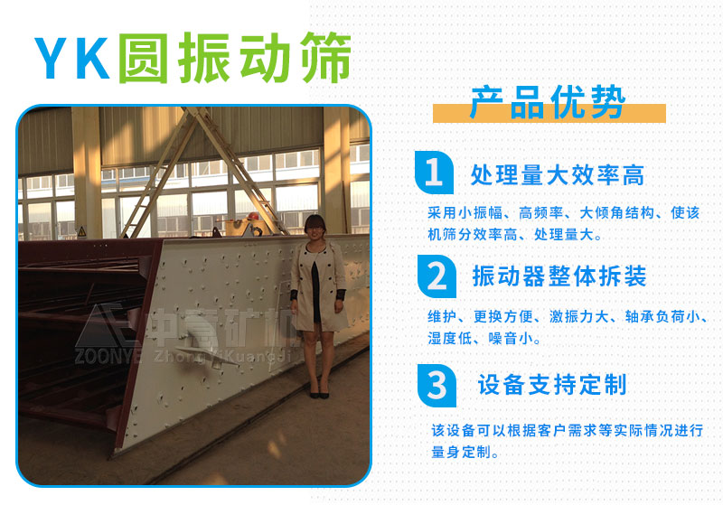 圓振動(dòng)篩是常見的篩分機(jī)的一種,廣泛應(yīng)用在破碎、制砂、選礦生產(chǎn)中。圓振動(dòng)篩做圓形運(yùn)動(dòng),是一種多層數(shù)、高效新型振動(dòng)篩,又稱為分級(jí)篩或篩分機(jī)等。圓振動(dòng)篩采用筒體式偏心軸激振器及偏塊調(diào)節(jié)振幅,物料篩淌線長(zhǎng),篩分規(guī)格多,具有結(jié)構(gòu)可靠、激振力強(qiáng)、篩分效率高、振動(dòng)噪音小、堅(jiān)固耐用、維修方便、使用安全等特點(diǎn),該振動(dòng)篩廣泛應(yīng)用于礦山、建材、交通、能源、化工等行業(yè)的產(chǎn)品分級(jí)。