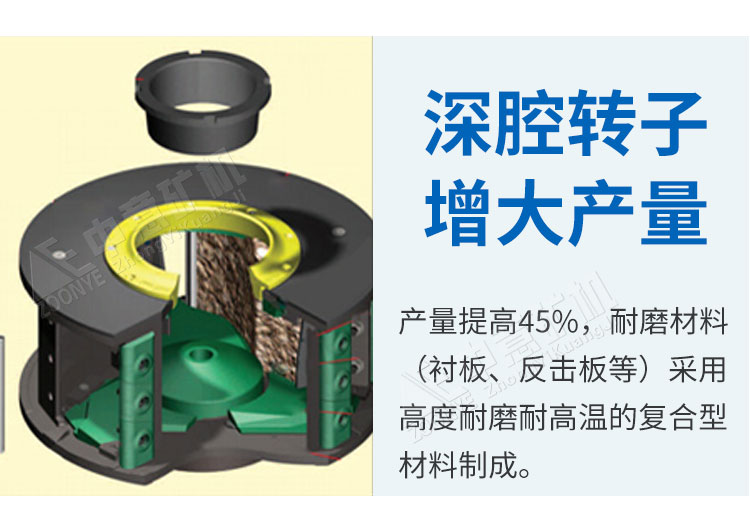 (1)中意VSI制砂機(jī)采用采用經(jīng)過優(yōu)化設(shè)計后的深腔型轉(zhuǎn)子,使物料通過量提高約30%;內(nèi)部更流暢的曲線形設(shè)計,降低物料的流動阻力,大幅度提高的物料通過能力,增加機(jī)器產(chǎn)能